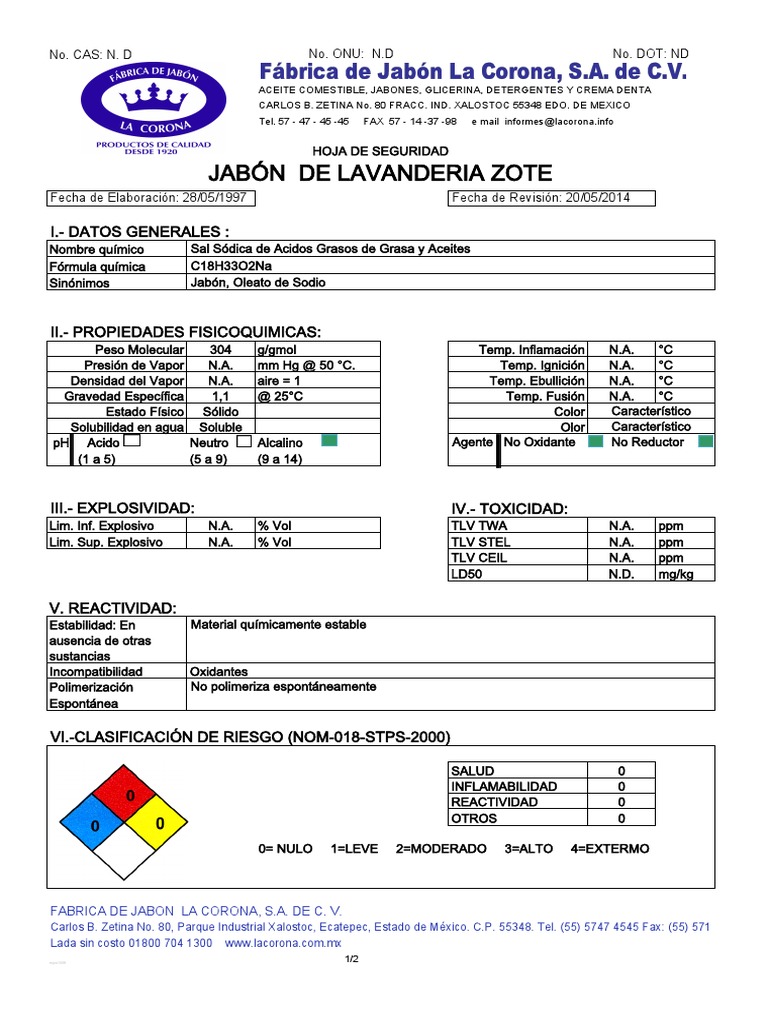 Ficha De Seguridad Jabon Zote Pdf Jabon Sodio