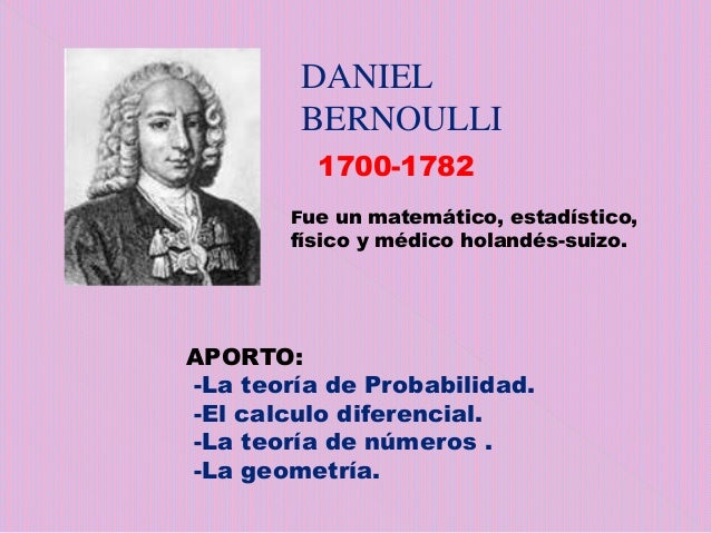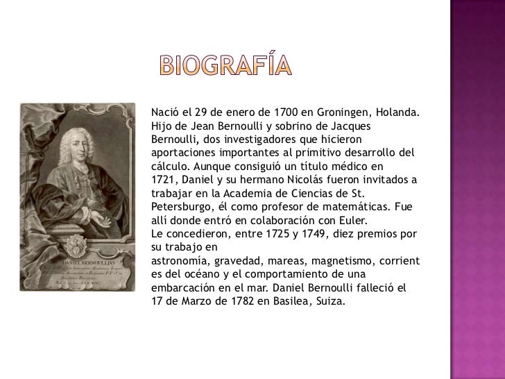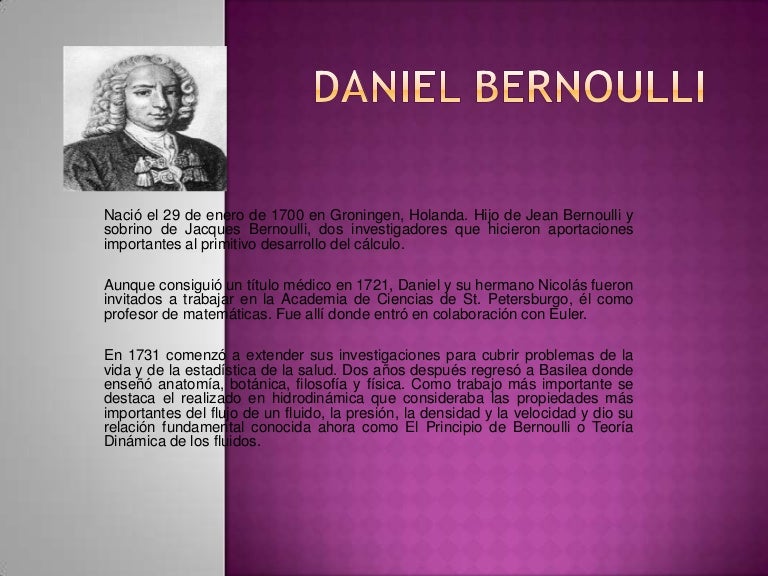 Aportaciones de daniel bernoulli. Uno de los refugiados fue Jacques Bernoulli quien. Daniel Bernoulli Daniel Bernoulli29011700 17031782Daniel BernoulliCientífico suizoNació el 29 de enero de 1700 en Groningen Holanda. Desde que la gran depresión comenzó a derrumbar la civilización occidental los eugenistas los genetistas los psicólogos los políticos y los dictadores por muy diferentes razones han prestado renovado interés en la controversia aun no resuelta de la herencia frente al medio.