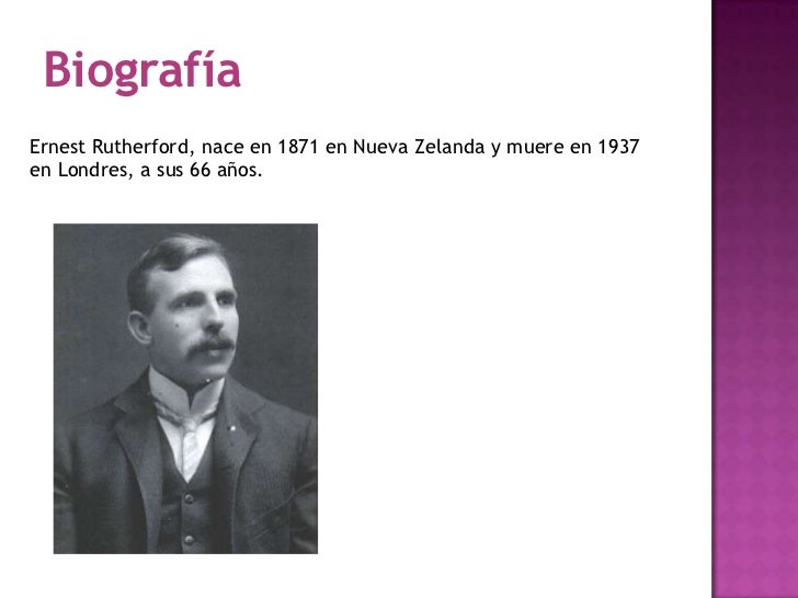 Estudios Cursó estudios en la Universidad de Nueva Zelanda y más adelante en la de Cambridge. Biografia de Ernest Rutherford Ernest Rutherford 1871-1937 foi um físico e químico neozelandês que pesquisando o urânio descobriu a emissão de raios alfa e beta deixando grande contribuição para a moderna teoria atômica. Ernest Rutherford de nacionalidad británica y neozelandesa nació en Brightwater Nelson Nueva Zelanda el 30 de agosto de 1871Gran físico y químico reconocido a nivel mundial por su descubrimiento de la radiactividad alfa y betaHijo número cuatro entre once hermanos del hogar conformado por el granjero James Rutherford y la maestra Martha Thompson.