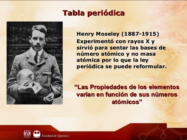 Antes de su descubrimiento los elementos se enumeraban por masa atómica. Henry Gwyn Jeffreys Moseley m oʊ z l i noviembre 23 1887 hasta agosto 10 1915 fue un Inglés físico cuya contribución a la ciencia de la física fue la justificación de las leyes físicas de la anterior empírica y química concepto de la atómica númeroEsto se deriva de su desarrollo de la ley de Moseley en el espectro de rayos-X. La ley de Moseley La ley de Moseley es una ley empírica que establece una relación sistemática entre la frecuencia de los rayos x emitidos por distintos átomos con su número atómico.