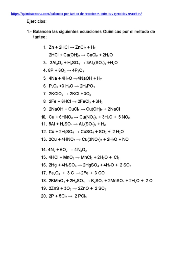 Ejercicios de balanceo de ecuaciones quimicas por tanteo pdf May 14 2020 admin Science Your search for ejerciciosresueltosdebalanceodeecuacionesquimicas pormetodoalgebraicopdf didnt match to any products. Para balancear una ecuacion quimica por redox se deben. Ba H2SO4 BaSO4 H2 2.