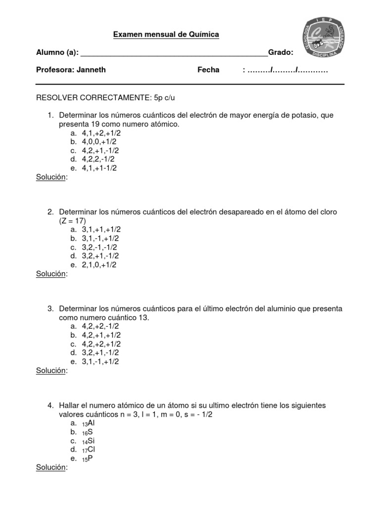 3 1 -1 12 Explicación. El nombre aluminio se deriva de la palabra latina alumen que se utiliza para describir alumbre de potasio o sulfato de aluminio y potasio KAl SO 4 2 12H 2 O. Electrón N 1 3 e- Z Los valores de los números cuánticos para los 6 e- del subnivel 3p e- número n l ml ms 1 4 3 3 1 1 1 1 12 -12 2 5 3 3 1 1 0 0 12 -12 3 6 3 3 1 1 -1 -1 12 -12.